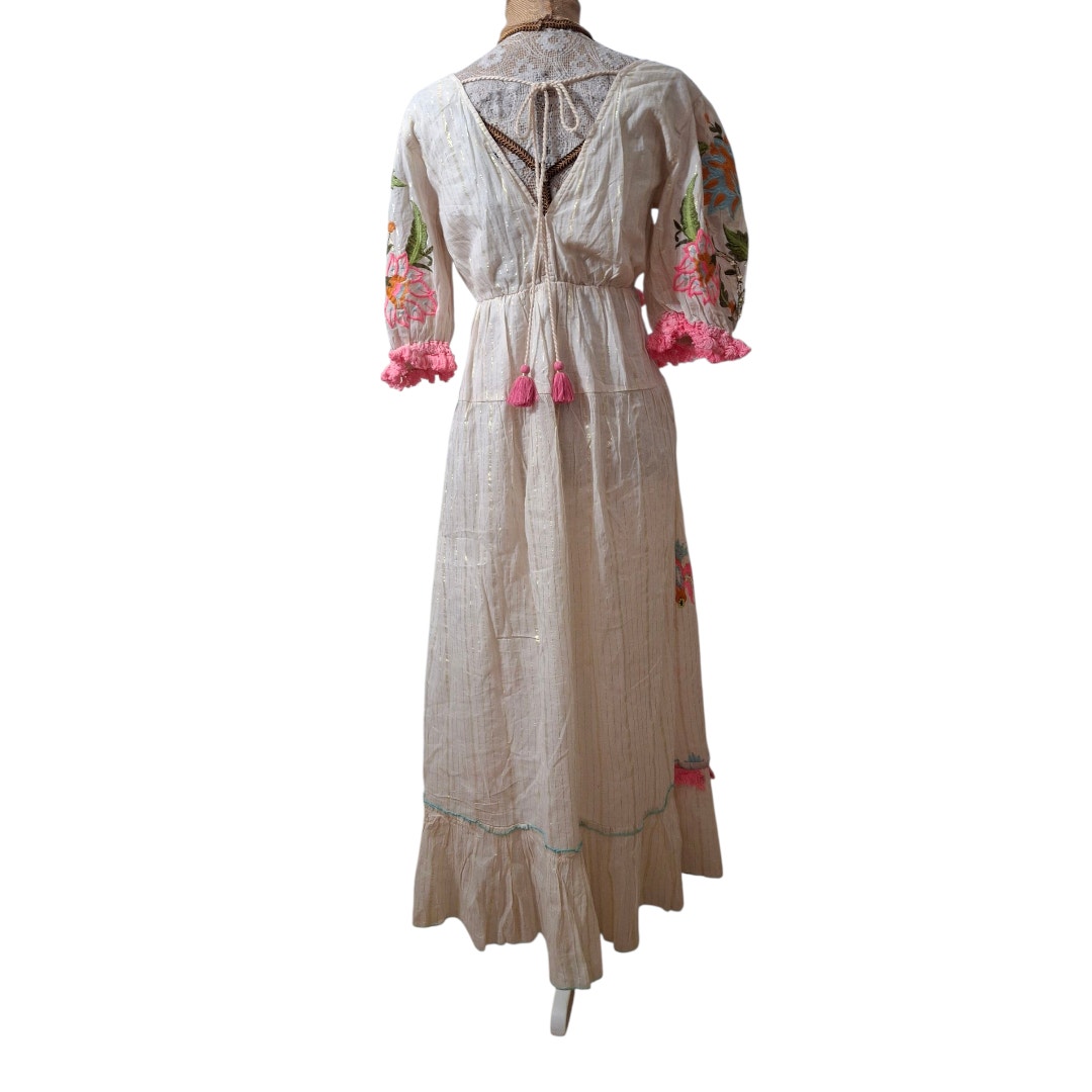 This stunning vintage-inspired maxi dress features intricate floral embroidery in vibrant pinks and corals. With puff sleeves, a flattering empire waist, and scalloped trim, it exudes romantic bohemian charm. Perfect for summer parties, festivals, or garden gatherings, this statement piece captures the beauty of handcrafted detail and timeless femininity.