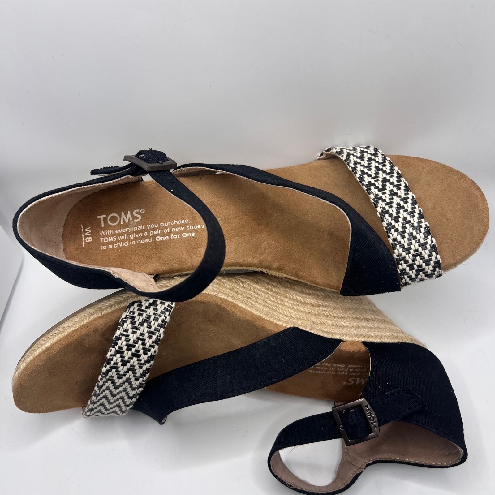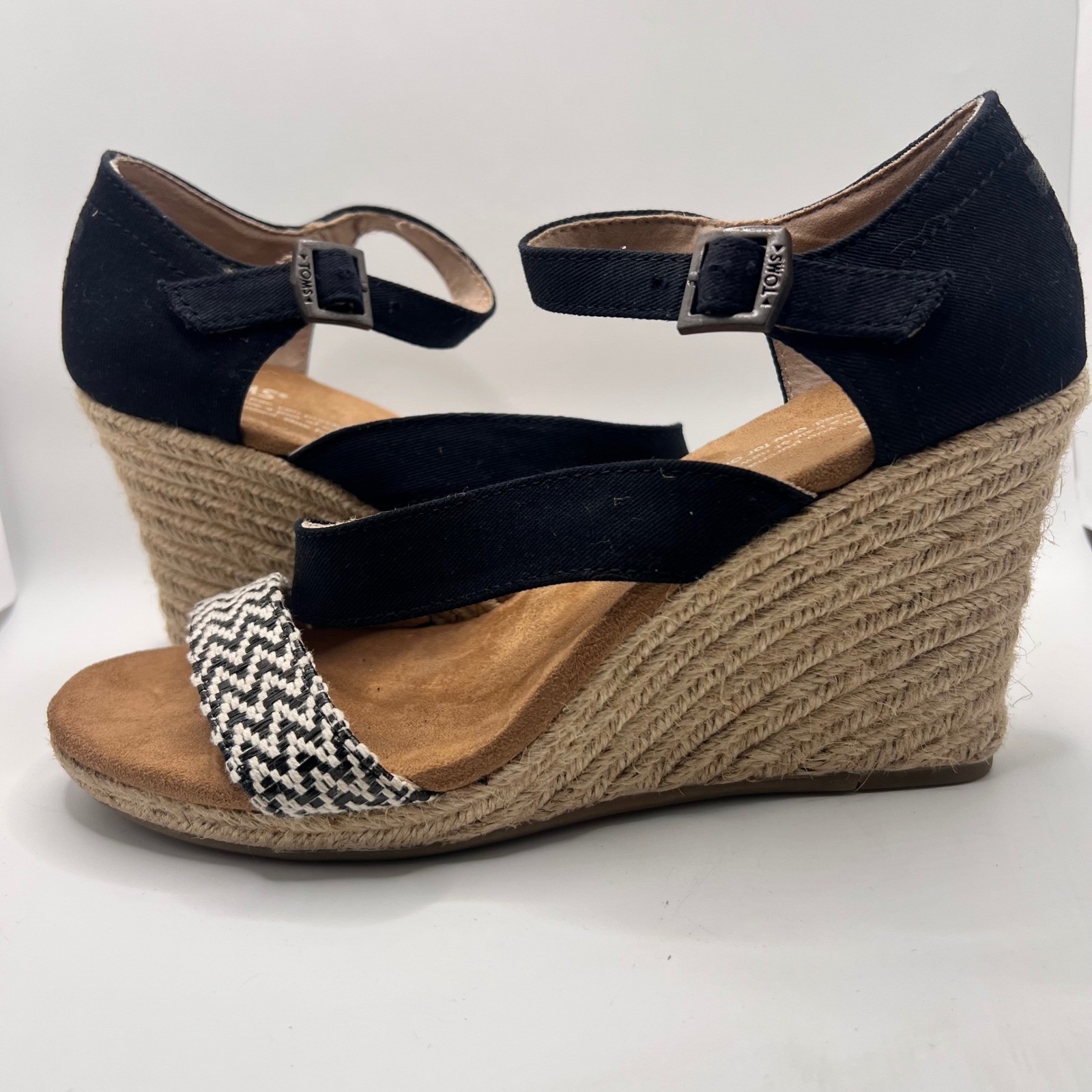 Elevate your warm-weather style with these chic TOMS espadrille wedge sandals. A sophisticated silhouette is crafted with a black canvas upper, complemented by a woven black and white accent strap across the toes. The adjustable ankle strap ensures a secure and comfortable fit, while the classic espadrille wedge heel adds a touch of effortless elegance. These sandals are perfect for a casual brunch, a summer wedding, or a night out with friends.